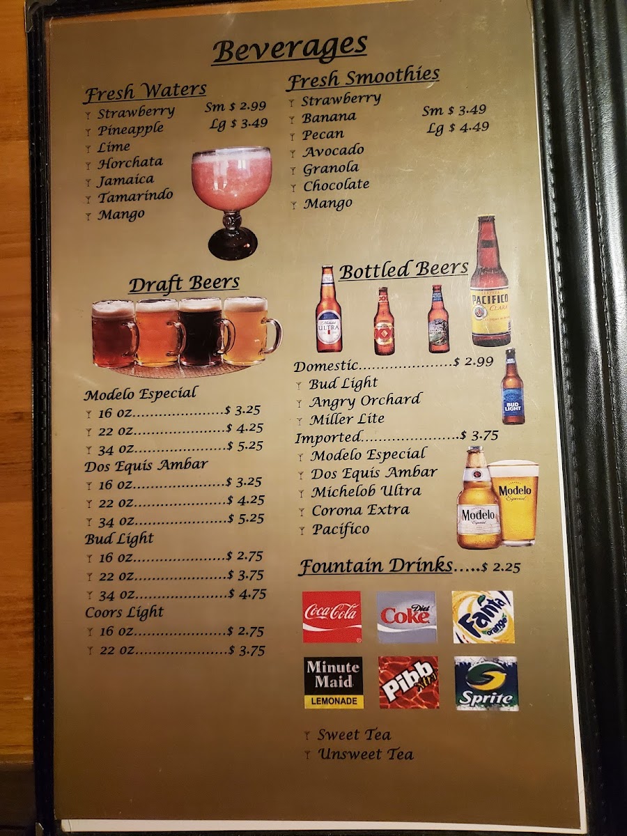 This is the kind of menu that lends itself well to both quick lunches and relaxed dinners, where you can enjoy hearty plates like arroz con pollo or sizzling fajitas in a welcoming, laid-back atmosphere. Fresh waters in flavors like strawberry and tamarindo provide a refreshing complement to the food, while draft beers such as Dos Equis Ambar add to the casual dining experience.